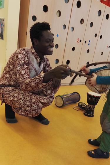 In seinen Workshops werden Alltagsleben und Kultur seiner Heimat auf authentische Weise erlebbar. Er stellt traditionelle westafrikanische Instrumente wie Kiémas, Ruudga und Lunga vor, die die Kinder selbst ausprobieren. Er tanzt und singt mit ihnen, wobei sie z.B. das Lied „Na nka ta ye“ (Wir sind noch nicht angekommen) in seiner Heimatsprache Mooré lernen. Er erzählt über die Musik und wie sie bei Festen oder im Alltag zum Einsatz kommen. Auf diese Weise erschließt sich das Leben in Burkina Faso und entsteht ein differenziertes Bild des Kontinents. Anschließend werden die Kinder all ihre Fragen los. Z.B. „Gibt es in Burkina Faso giftige Spinnen?“ „Arbeiten die Leute bei Euch?“ „Warum hast du als Kind keinen Geburtstag gefeiert?“